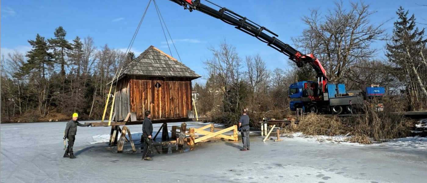 Eines der beliebtesten Fotomotive unserer Gemeinde wurde am 8. Februar 2024 buchstäblich auf neue Füße gestellt. Das Mönchshäusl am Mitterteich drohte durch die jahrelangen Witterungseinflüsse langsam im Teich zu versinken. Dieses Szenario wurde mit der Unterstützung der Firmen Sereinig aus Moosburg und Aspernig aus Klagenfurt abgewendet. Neue Lärchenpfosten wurden an dieser Stelle in den mehrere Meter tiefen Teich eingeschlagen und das Häusl mittels Kran neu aufgesetzt. Die Lärchenstämme versprechen wieder jahrzehntelange Haltbarkeit und somit ist das Fotomotiv für die nächsten Jahre und Jahrzehnte wieder fest verankert und gerettet.