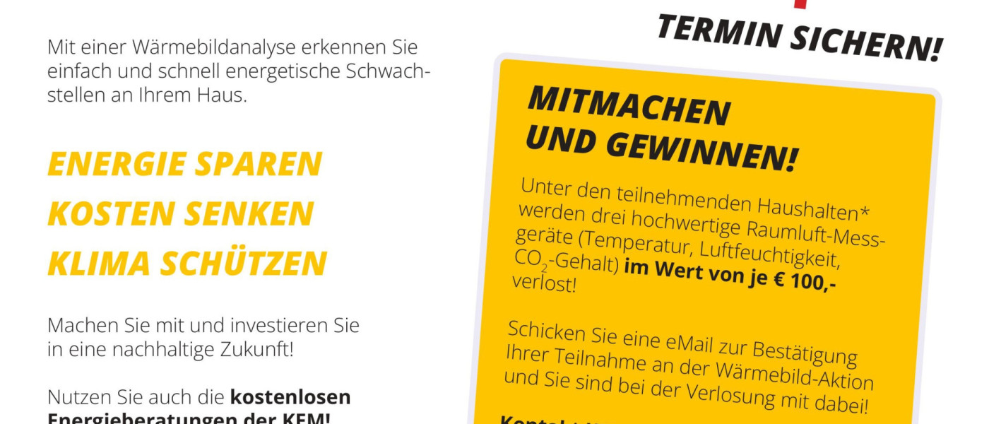 Vom 2.01.2025 bis 28.02.2025 können Einfamilienhausbesitzer an der Wärmebildaktion von „Unser Lagerhaus“ teilnnehmen: Einfach und schnell können energetische Schwachstellen erkannt werden. Alle teilnehmenden Haushalte nehmen an der Verlosung von drei hochwertigen Raumluft-Messgeräten teil, einer Aktion der KEM – Klima- und Energie-Modellregion Wörthersee Karolinger. Alle Informationen finden Sie im angefügten Flugblatt.