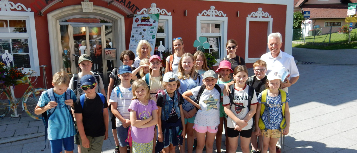 Die Schülerinnen und Schüler der 3. Klasse der VS Tigring besuchten mit ihren Lehrerinnen Christa Fabian und Patricia Ludwig-Feichtinger am Montag das Marktgemeindeamt. Sie wurden vom Herrn Bürgermeister herzlich empfangen und er erklärte ihnen, was im Amt so alles erledigt wird und wofür Gemeinden zuständig sind. In den dritten Klassen wird im Unterricht neben vielen anderen Themen ja auch die Heimatgemeinde durchgenommen. Ein Besuch im Gemeindeamt gehört da natürlich auch dazu. Der Bürgermeister zeigte den interessierten kleinen Besucher*innen zuerst die Räumlichkeiten im Amt. Anschließend gab es eine lehrreiche „Unterrichtsstunde“ Im Karolinger Saal – im Gemeindezentrum Schallar. Zur Erinnerung gab es für alle die Broschüre „Meine Gemeinde, mein Zuhause“. Der Herr Bürgermeister bedankt sich für den lieben Besuch und wünscht allen schöne Ferien!