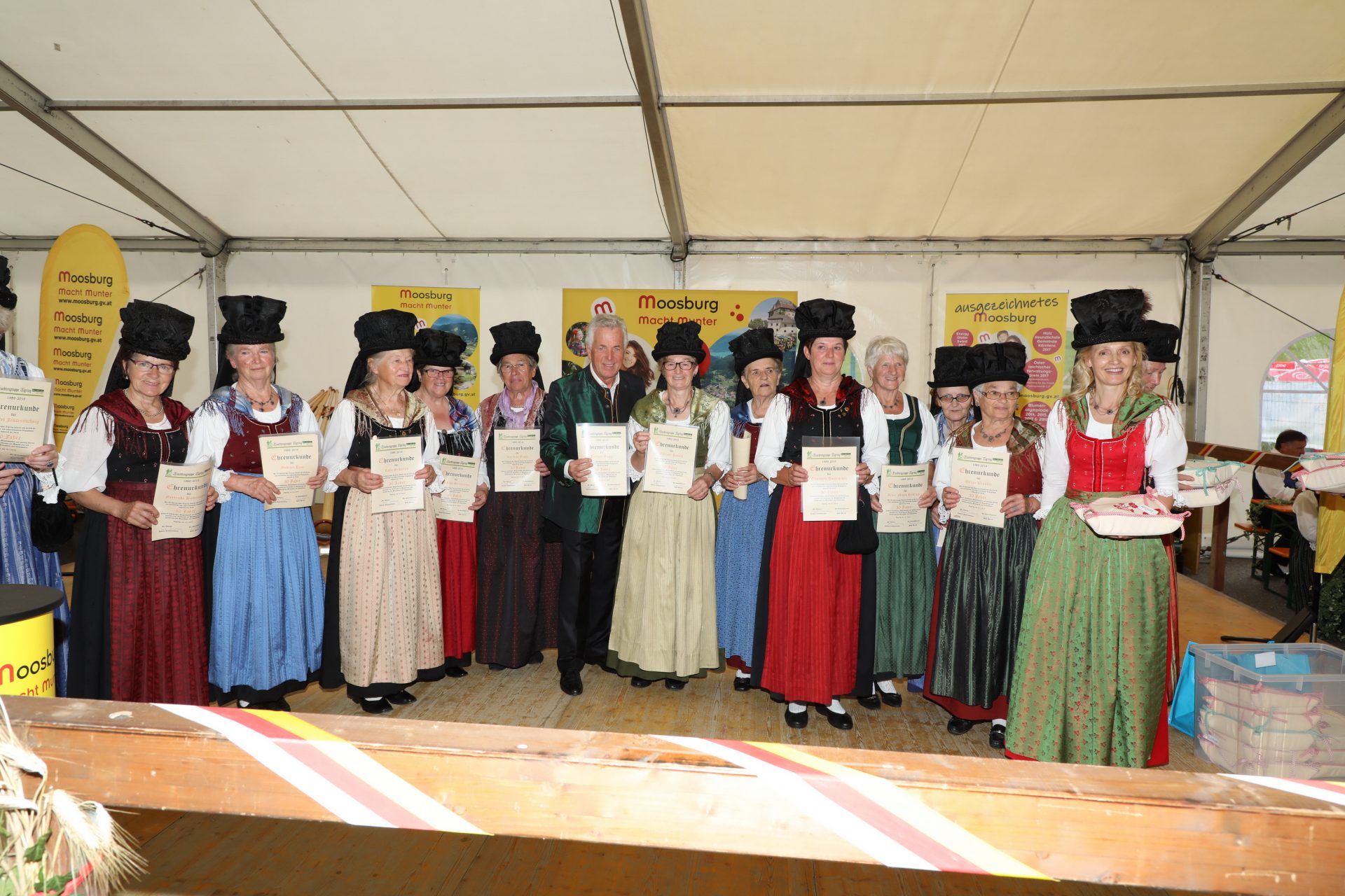 Der anschließende Festakt im Festzelt auf der Schlosswiese, wurde vom Blasorchester der Marktgemeinde Moosburg eröffnet. Die Moderation und Begrüßung wurde von unserem Mitglied Hubert Sickl vorgenommen. Die Obfrau Ing. Isabella Jessenitschnig, MA bedankte sich in ihrer Festansprache bei ihrer Vorgängerin Gerti Biedermann für die hervorragende Arbeit und betonte, dass die Trachtengruppe nicht nur ein Verein, sondern ein Auftrag für die Gesellschaft sei, der von der Jugendarbeit bis zur Weiterbildung der Mitglieder und auch der Bevölkerung einen sehr weiten Bogen spannt. Die Trachtengruppe ist ein wichtiges Glied in der Kette der Bewahrer und Weiterentwickler von Tradition und Kultur über die Gemeindegrenzen hinaus. Der Obmann des ebenfalls jubilierenden Kanaltaler Kulturvereines in Kärnten – Karlheinz Moschitz – gratulierte mit einer großen Abordnung und seinen Alphornbläsern der Trachtengruppe Tigring zum Jubiläum und skizzierte die Aufgaben seines Vereines. Für verdiente Mitglieder beider Vereine erfolgten Ehrungen durch das Kärntner Bildungswerk, vertreten durch den Obmann DI Peter Fercher und der Bezirksobfrau Elisabeth Putz sowie durch den Landesobmann des Kärntner Brauchtumsverbandes Dr. Wolfgang Lattacher: