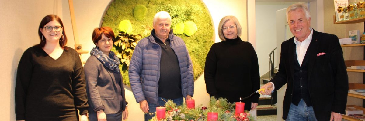 Sarah Sereing, Ursula Madritsch, Heinz Eichwalder, Sylvana Wobak und Bgm Herbert Gaggl bei der Übergabe des Adventkranzes.