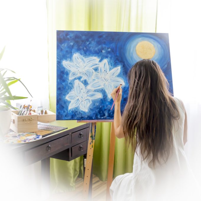„Für mich ist das Malen Meditation und mit den kreativen Energien befreie ich mich vom Staub des Alltags und tauche ein in eine andere Welt“, so die Künstlerin. Das Ergebnis sind vielfältige Kunstwerke, jedes mit einer anderen Geschichte, einer anderen Energie – entstanden durch unterschiedlichste Maltechniken und Farbarrangements.