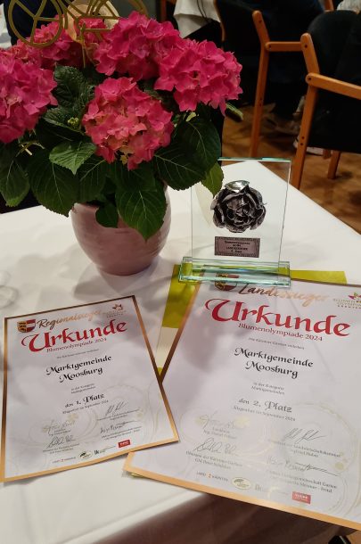 Moosburg wurde heuer zur landesweit zweitschönsten Marktgemeinde gekührt, in der Regionalwertung wurde der Sieg heimgefahren. So konnte bei der diesjährigen Schlussveranstaltung und Siegerehrung in Pörtschach die Silberne Rose von Bgm LAbg Hergert Gaggl in Empfang genommen werden. In der B-Wertung, zu der sich wieder zahlreiche Betriebe, Gartenbesitzer und Hobby-Gärtnerinnen und Gärtner angemeldet haben, gab es ebenso in der Regionalwertung einen zweiten Platz für Frau Gabriela Sacher für ihren wunderschönen Garten, und einen dritten Platz für Frau Karin Lamrecht, deren Balkonschmuck bereits von weitem grüßt, wenn man von Krumpendorf kommend nach Moosburg hereinfährt.