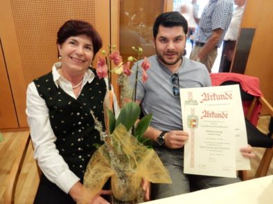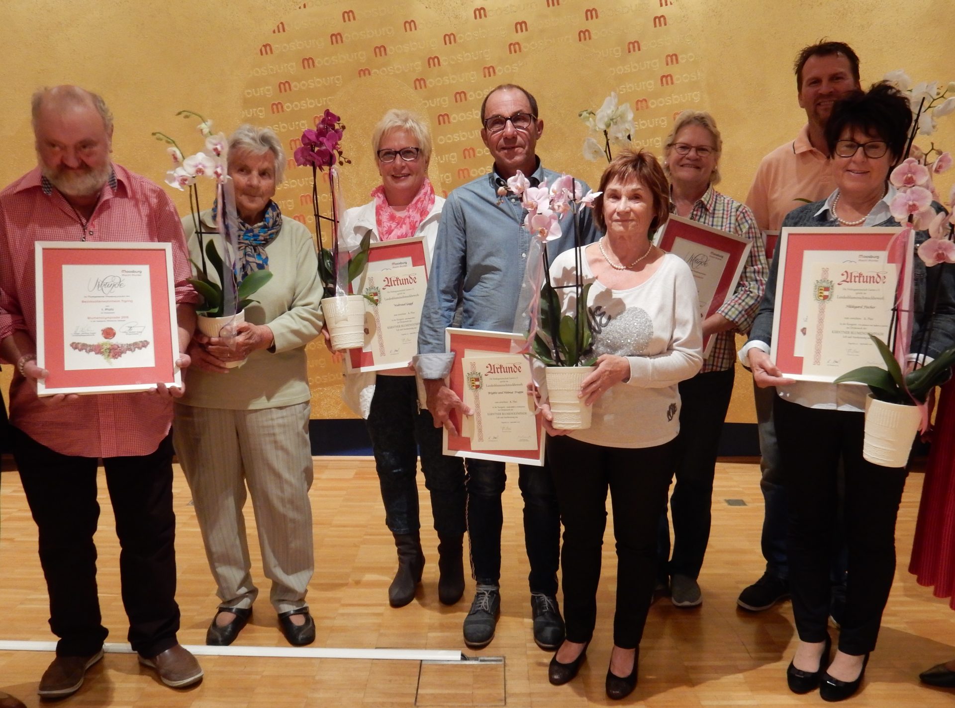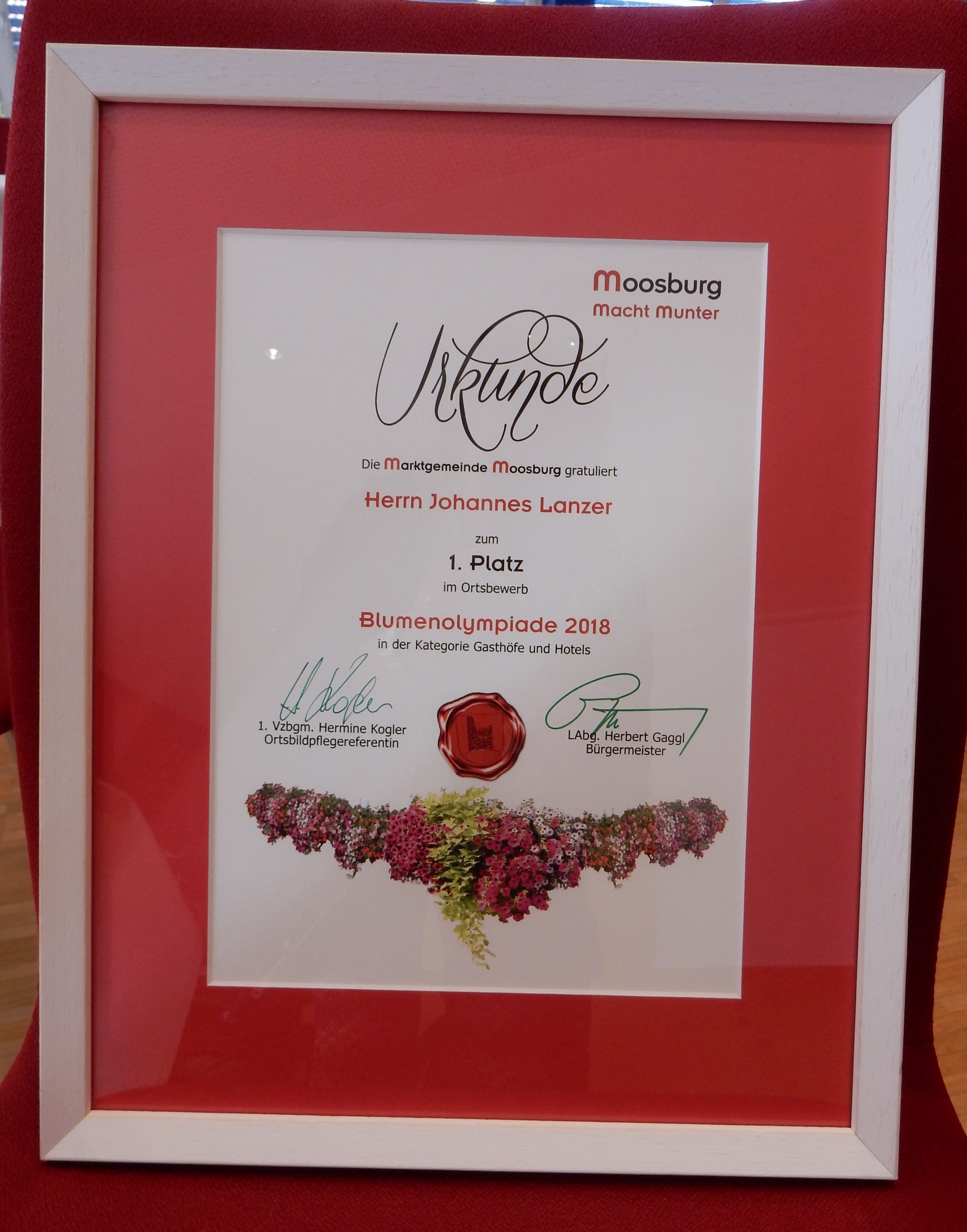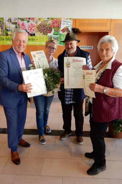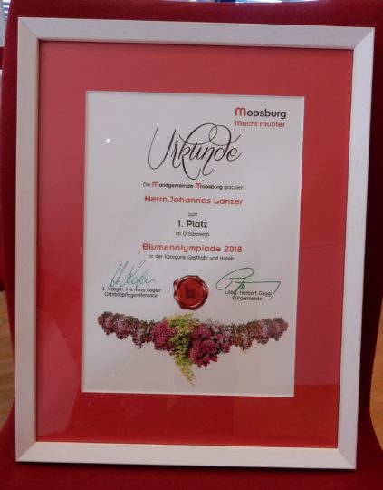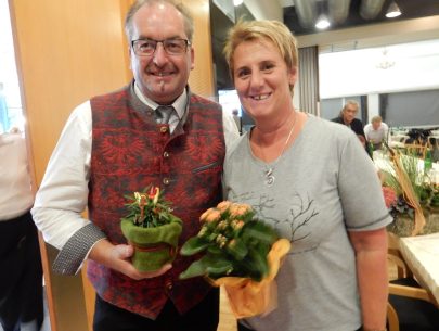 Die gemeindeinterne Siegerehrung fand am 22. Oktober 2018 um 19 Uhr im Karolinger Saal statt, zu der alle diesjährigen Teilnehmer sehr herzlich eingeladen waren. Die Ortsbildreferentin Vzbgm. Hermine Kogler und Herr BGM Herbert Gaggl haben sich herzlich bei allen für ihre Bemühungen bedankt und sie gebeten, sich auch im nächsten Jahr wieder zur Blumenolympiade anzumelden. Ein besonderer Dank ging an unsere Mitarbeiter Ingrid Sagmeister und Bauhofleiter Hermann Koraschnig mit seinem Team, die hauptsächlich für die Gestaltung des Blumenschmucks im ganzen Ort verantwortlich sind. Musikalisch schwungvoll umrahmt wurde der Abend von „Catharina und Franky“, kulinarisch verwöhnt wurden die Teilnehmer von der Buschenschank Wassacher. Beim „Nachschauen“ der schönsten Bilder konnte der Blumenschmuck der Marktgemeinde Moosburg im Jahresablauf bewundert werden. Die Blumenbilder der Preisträger wurden diesmal in ein Ratespiel verpackt, das „heitere Blumen-Raten“ hat allen viel Spaß gemacht.