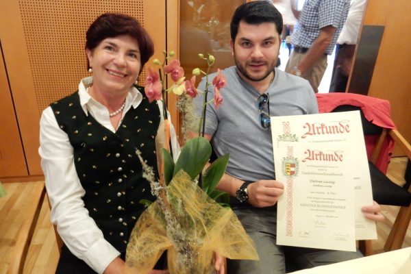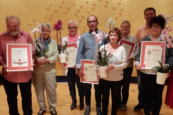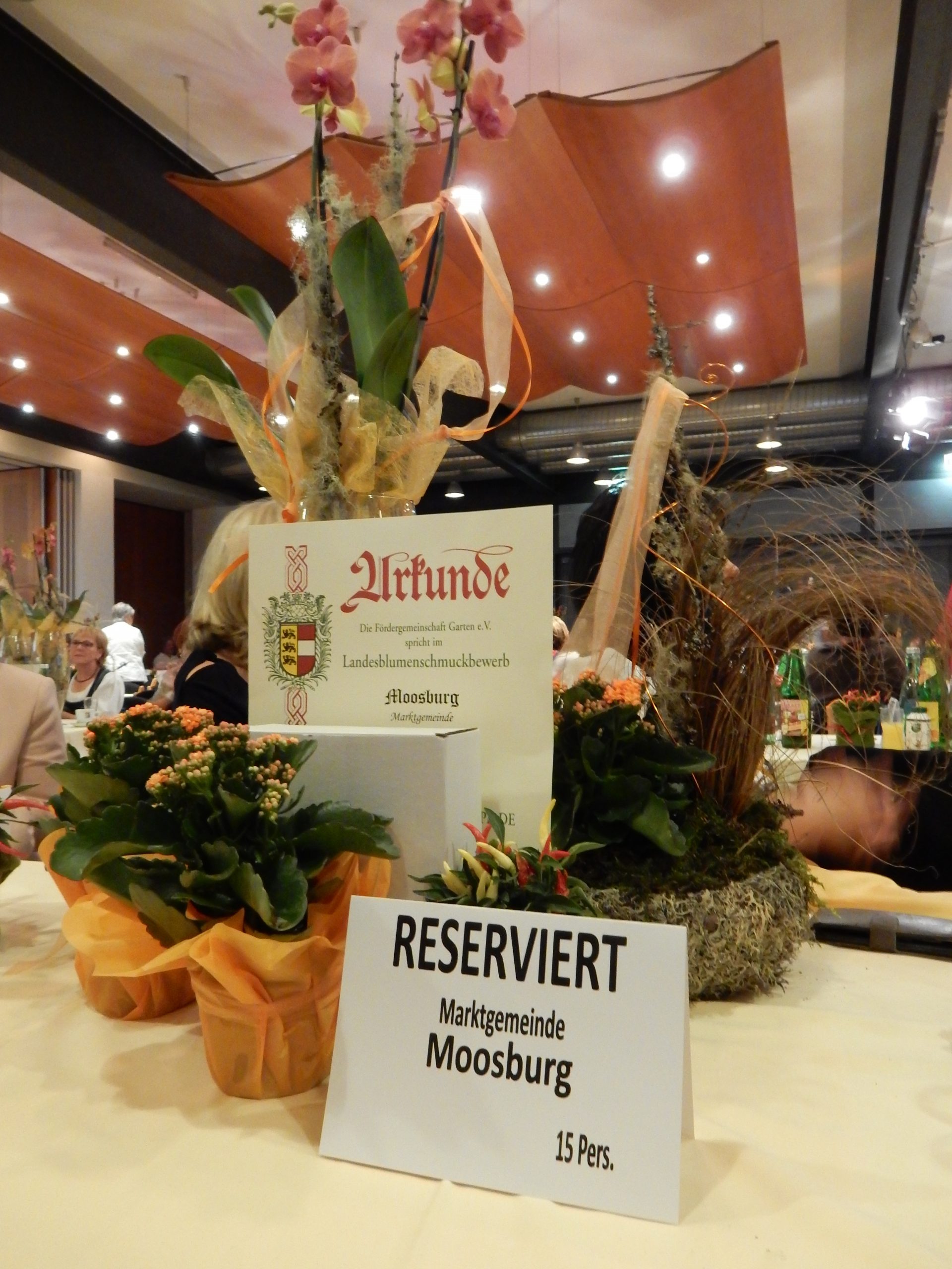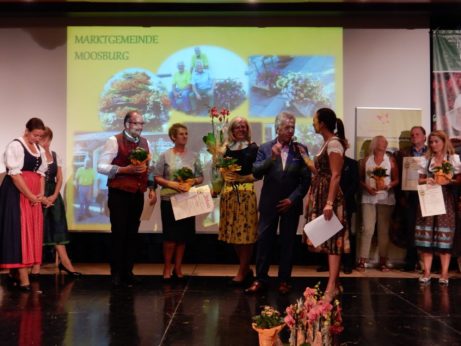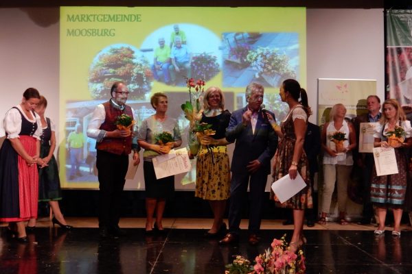 Mit Spannung wurden die Ergebnisse der diesjährigen 21. Blumenolympiade erwartet – das Geheimnis, wer die diesjährigen Sieger sind, wurde bei der Abschlussveranstaltung am 16. September im Congress-Center Pörtschach endlich gelüftet: Die goldene Rose – der 1. Platz in der landesweiten Wertung – ging wieder an die Marktgemeinde Moosburg, die unsere „Blumenbeauftragten“ Ingrid Sagmeister und Hermann Koraschnig, gemeinsam mit Frau Vzbgm. Hermine Kogler, strahlend in Empfang genommen haben. Auch bei den Gewerbebetrieben konnte eine Moosburgerin die goldene Rose heimfahren: Frau Dietrun Lassnig vom gleichnamigen Landhaus. In der Regionalwertung konnten wir auch noch punkten: In der Kategorie Gewerbebetriebe und Pensionen erreichte der Installationsbetrieb Roland Uhr den 2. Platz, in der Kategorie Privathäuser Frau Hildegard Fischer ebenfalls den 2. Platz und Frau Karin Lamprecht konnte für ihren Fenster-und Blumenschmuck ebenso den 2. Platz erreichen. Die strahlenden Sieger durften neben ihren Rosen-Pokalen und Urkunden auch wunderschöne Blumenarrangements in Empfang nehmen. Musikalisch umrahmt wurde die Veranstaltung von der jungen Funk-Brass-Band „Blowing Doozy“, bei der der Moosburger Stephan Lerchbaumer das Bariton-Saxophon spielt, sowie von Margot Loibnegger, die sehr charmant Blumenlieder von Robert Stolz zum Besten gab.