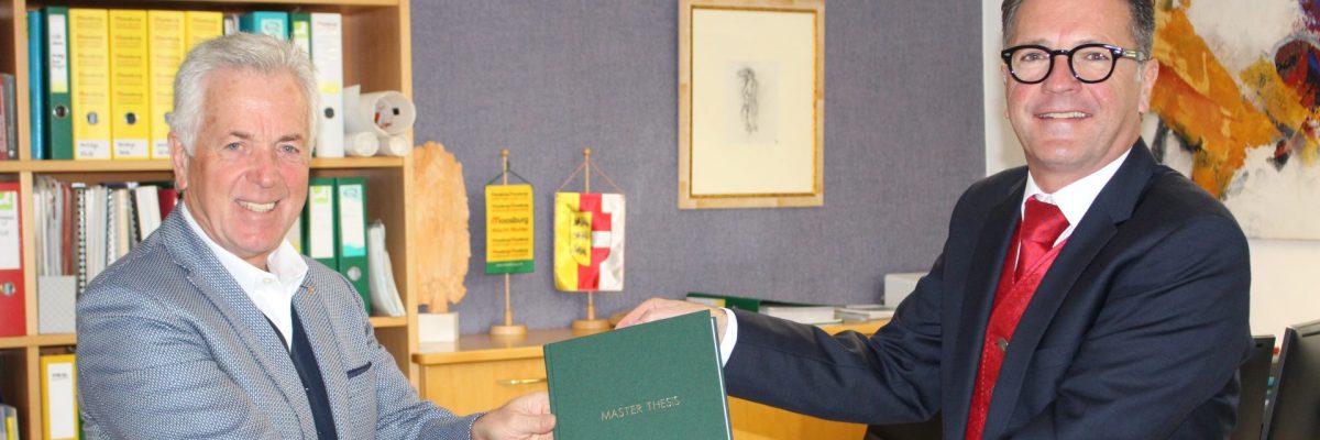 Norbert Pichler übergibt seine Master Thesis an LAbg Bürgermeister Herbert Gaggl.