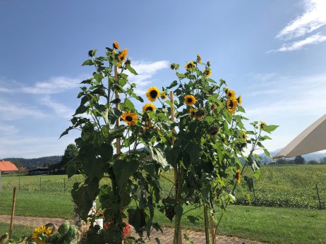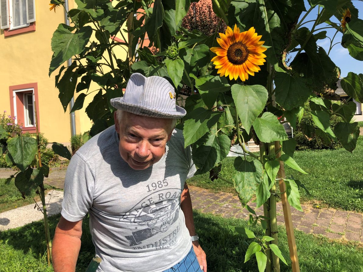 Jedes Jahr beginnt Herr Walter Taferner aus dem Bezirksaltenwohnheim Tigring schon früh mit dem Aussähen der Samen für seine Sonnenblumen. Er hegt und pflegt die Pflänzlein mit großer Liebe und gießt diese täglich, wie er berichtet. Die Sonnenblumen danken es ihm mit voller Pracht, wie auf den Bildern zu sehen ist. Das Bezirksaltenwohnheim wird von den außergewöhnlich hohen Sonnenblumen verschönert und man sitzt gerne auf dem Bankerl davor zum Verweilen nieder. Vielen lieben Dank, Herr Walter, für diese Blumenpracht, an der sich viele Menschen rundherum erfreuen können!