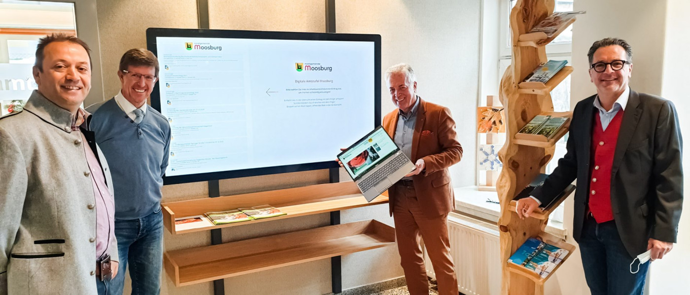 Andreas Lanner (Lanmedia), Walter Fox (Pixelpoint), Bgm Herbert Gaggl und AL Norbert Pichler (vl) präsentieren die digitale Amtstafel