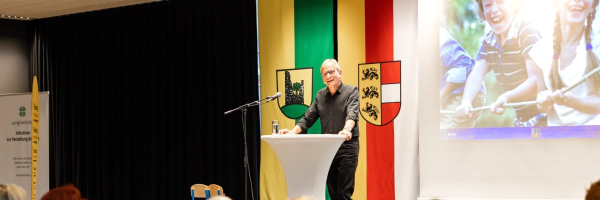 Die drei wesentlichen Säulen des Moosburger Glücksprojekts sind „den Augenblick genießen“, „Glück empfinden“ und „Zeit nehmen“. Was kann es Schöneres geben, wenn diese drei Überthemen an einem Abend mehr als erfüllt werden? So geschehen am Freitag, dem 15. April 2023. Die Zutaten waren ein prallgefüllter Saal mit vielen interessierten Menschen aus der Region, eine großartige Raumatmosphäre in der neuen Campus-Mensa und ein gut gelaunter und höchst motivierter Arnold Mettnitzer als Hauptredner des Abends. Rund drei Stunden tauchten die Teilnehmenden ein in ganz persönliche Geschichten, besondere Anekdoten aus der Psychotherapiepraxis und in Wissensverknüpfungen zu den unterschiedlichen Initiativen rund ums Glück in Moosburg.