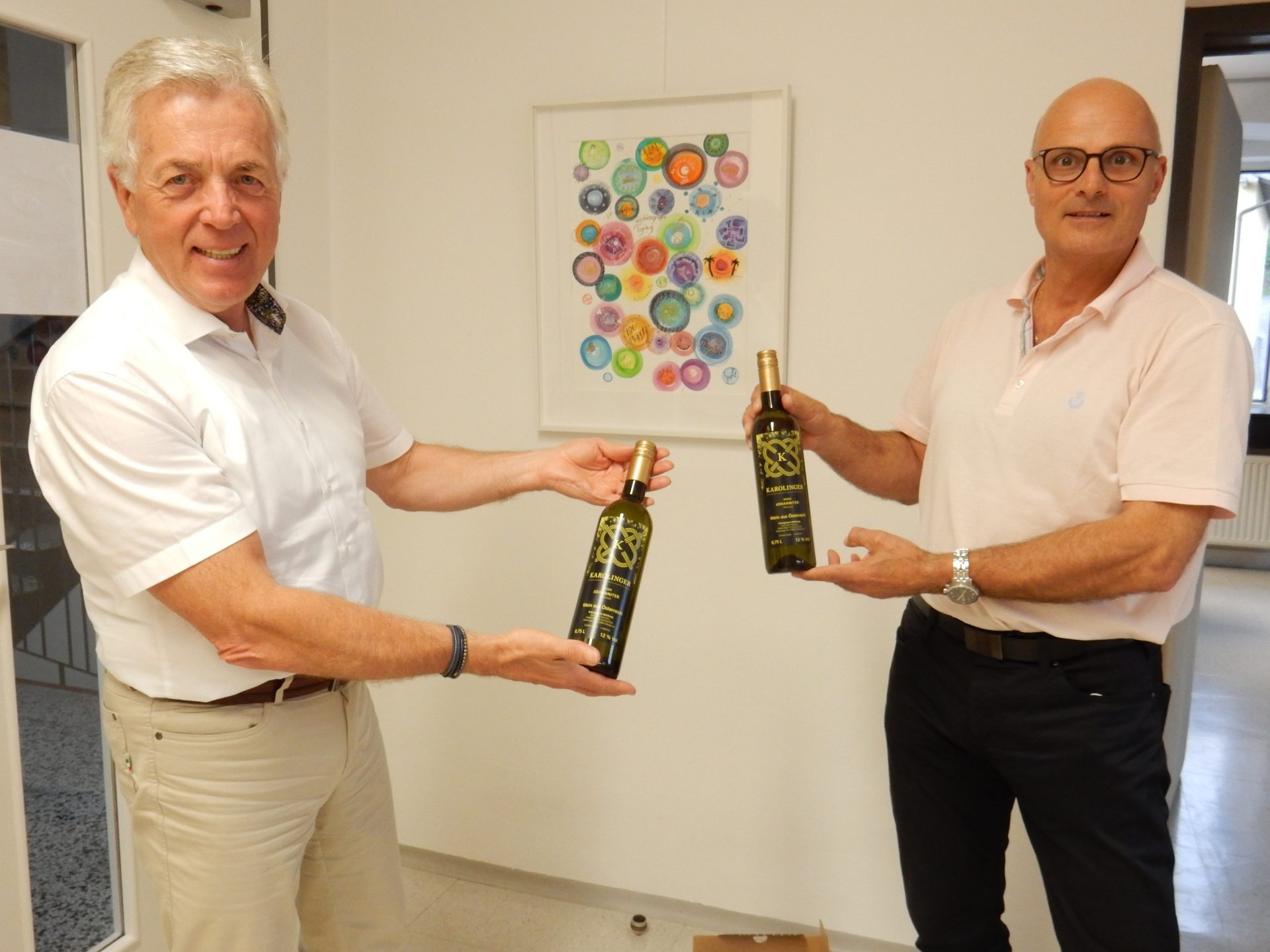 Voll Stolz konnte Robert Mack, auch in Vertretung seines Winzerkollegen, Gerfried Pink, unserem Bürgermeister, Herbert Gaggl, die ersten Flaschen der Ernte 2020 überreichen.