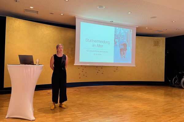 Zeitgleich fand auch der Vortrag über Sturzprävention im Alter statt. Die Physiotherapeutin Frau Katrin Reichstamm MSc berichtete, dass über 90% der Stürze im Haushalt passieren und das Frauen ein höheres Sturzrisiko haben als Männer. Sie regte an, Übungen in den Alltag einzubauen, um Stürzen vorzubeugen.