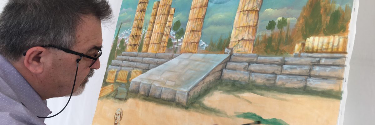 Anlässlich der Eröffnung des „Moosburger Glücksparcours“ weilte Professor Konstantinos Xenopolous in Moosburg. Er malte ein Bild des Tempels von Delphi mit dem Nabel der Welt, das im Paradiesgarten aufgestellt wird.