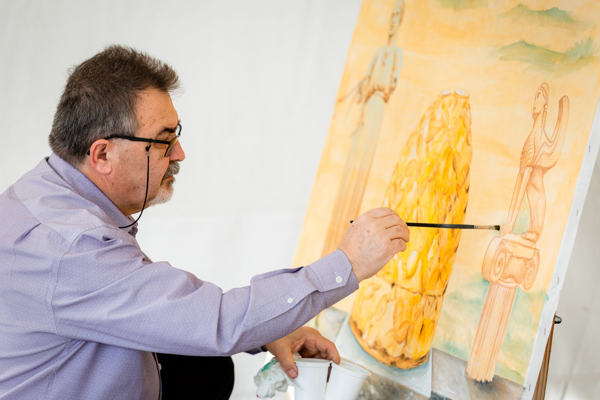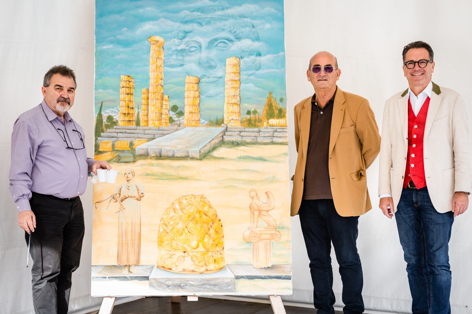 Anlässlich der Eröffnung des „Moosburger Glücksparcours“ weilte Professor Konstantinos Xenopolous in Moosburg. Er malte ein Bild des Tempels von Delphi mit dem Nabel der Welt, das im Paradiesgarten aufgestellt wird.