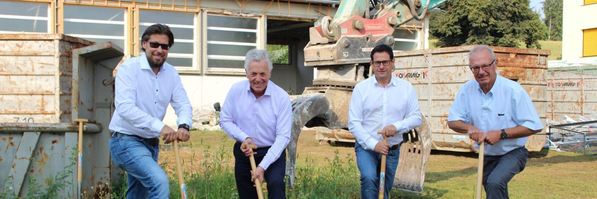 Bauleiter Gottfried Ramsbacher (KSW), LAbg Bgm Herbert Gaggl, Schulgemeindeverband-Obmann Bgm Arnold Marbek und KSW-Vorstand Dr. Klaus Wutte (v.l.) nahmen den Spatenstich vor.