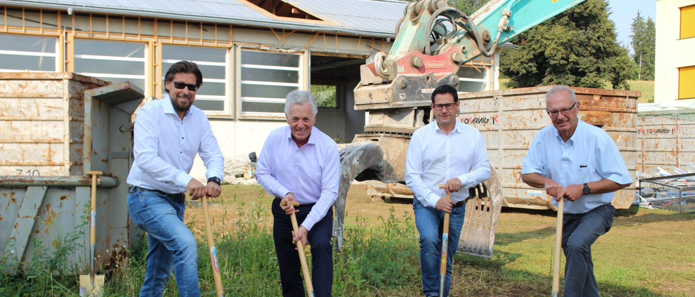 Bauleiter Gottfried Ramsbacher (KSW), LAbg Bgm Herbert Gaggl, Schulgemeindeverband-Obmann Bgm Arnold Marbek und KSW-Vorstand Dr. Klaus Wutte (v.l.) nahmen den Spatenstich vor.