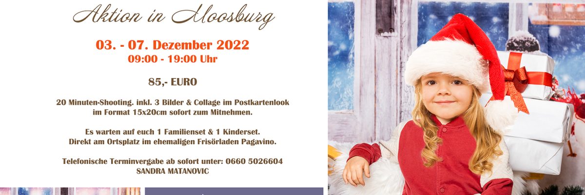 In Moosburg finden von Samstag 03. – Mittwoch 07. Dezember 2022 immer zwischen 09:00-19:00 Uhr Fotoshooting-Tage statt.