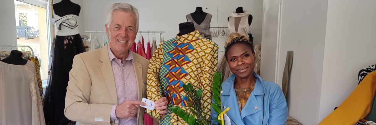 Davon konnte sich auch Herr Bürgermeister Herbert Gaggl bei seinem Besuch überzeugen „es ist eine Freude so eine engagierte und kreative Unternehmerin in Moosburg begrüßen zu dürfen“. Gemeinsam wurde gleich eine Idee für ein neues Glücks-Accessoire kreiert, welches demnächst erhältlich sein soll. Ein weiteres Angebot des Ateliers ist das Reparaturen- und Änderungsservice. Die Öffnungszeiten sind: Montag bis Donnerstag von 10-14Uhr, außerhalb der Öffnungszeiten kann ein persönlicher Termin unter 0676/5912821 vereinbart werden. Frau Génése Akomi freut sich auf ihren Besuch.