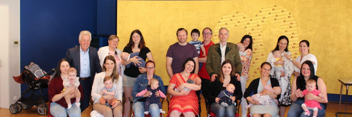 Am 19. Mai wurden die neuen Erdenbürger, natürlich mit stolzer Mama und Papa, zu Kaffee und Kuchen in gemütlicher Atmosphäre in den Karolinger Saal eingeladen. Natürlich darf auch ein Willkommens-Geschenk nicht fehlen: ein bequemer Moosburger Windelrucksack und ein Greifling wurden übergeben.