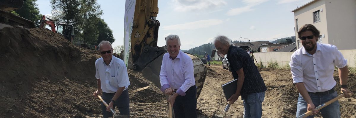 „Moosburg ist ein idealer Lebensstandort. Das Ortszentrum wird durch diese Wohnungen weiter aufgewertet. Ich freue mich auch, dass gerade in diesen schwierigen Zeiten in unserer Gemeinde kräftig investiert wird“, sagt Bürgermeister Herbert Gaggl (2.v.l.), der mit KSW-Vorstand Dr. Klaus Wutte (1.v.l.) und Prokurist Ing. Gottfried Ramsbacher den Spatenstich vornahm.