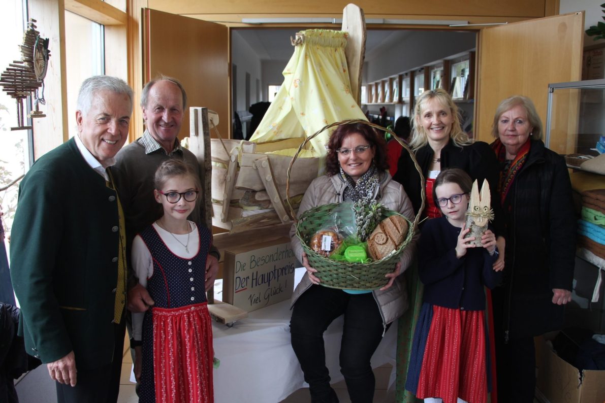 LAbg. Bgm. Herbert Gaggl, der Gewinner des Hauptpreises Walter Jessenitschnig, Gewinnerin vom Geschenkskorb Sabine Leeb, Obfrau Isabella Jessenitschnig, Nussholzspenderin Eveline Schwarz aus Velden sowie die zwei Mädels der Trachtenjugend Kate Gugganig und Elisa Janach, die den Losverkauf durchführten.
