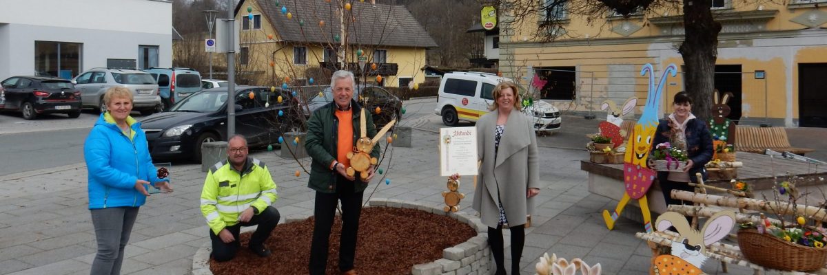 Die Preise und Urkunden werden daher von der Fördergemeinschaft Garten direkt in die teilnehmenden Gemeinden gebracht und persönlich übergeben. Gärtnermeisterin Margarita Messner-Fritzl aus Griffen hat Vbgm Hermine Kogler und Bgm Herbert Gaggl die bronzene Rose für den 3. Platz in der Landeswertung, die Urkunde und einen frühlingshaften Blumengruß überbracht.