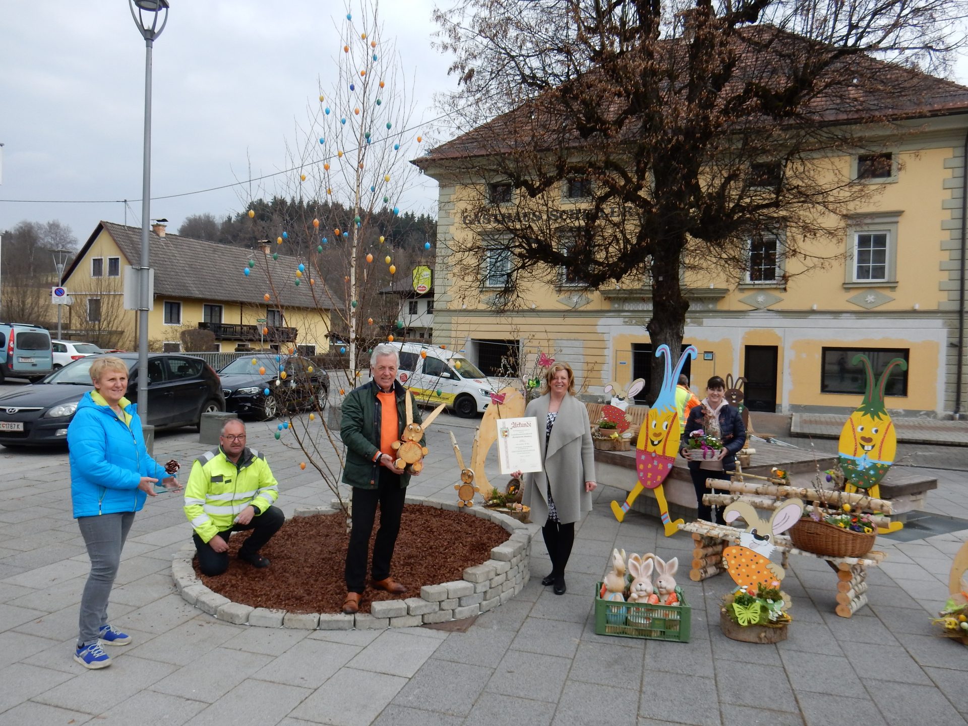Die Preise und Urkunden werden daher von der Fördergemeinschaft Garten direkt in die teilnehmenden Gemeinden gebracht und persönlich übergeben. Gärtnermeisterin Margarita Messner-Fritzl aus Griffen hat Vbgm Hermine Kogler und Bgm Herbert Gaggl die bronzene Rose für den 3. Platz in der Landeswertung, die Urkunde und einen frühlingshaften Blumengruß überbracht.