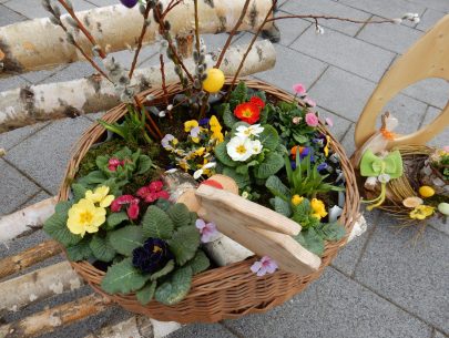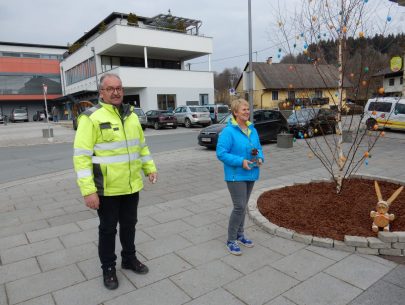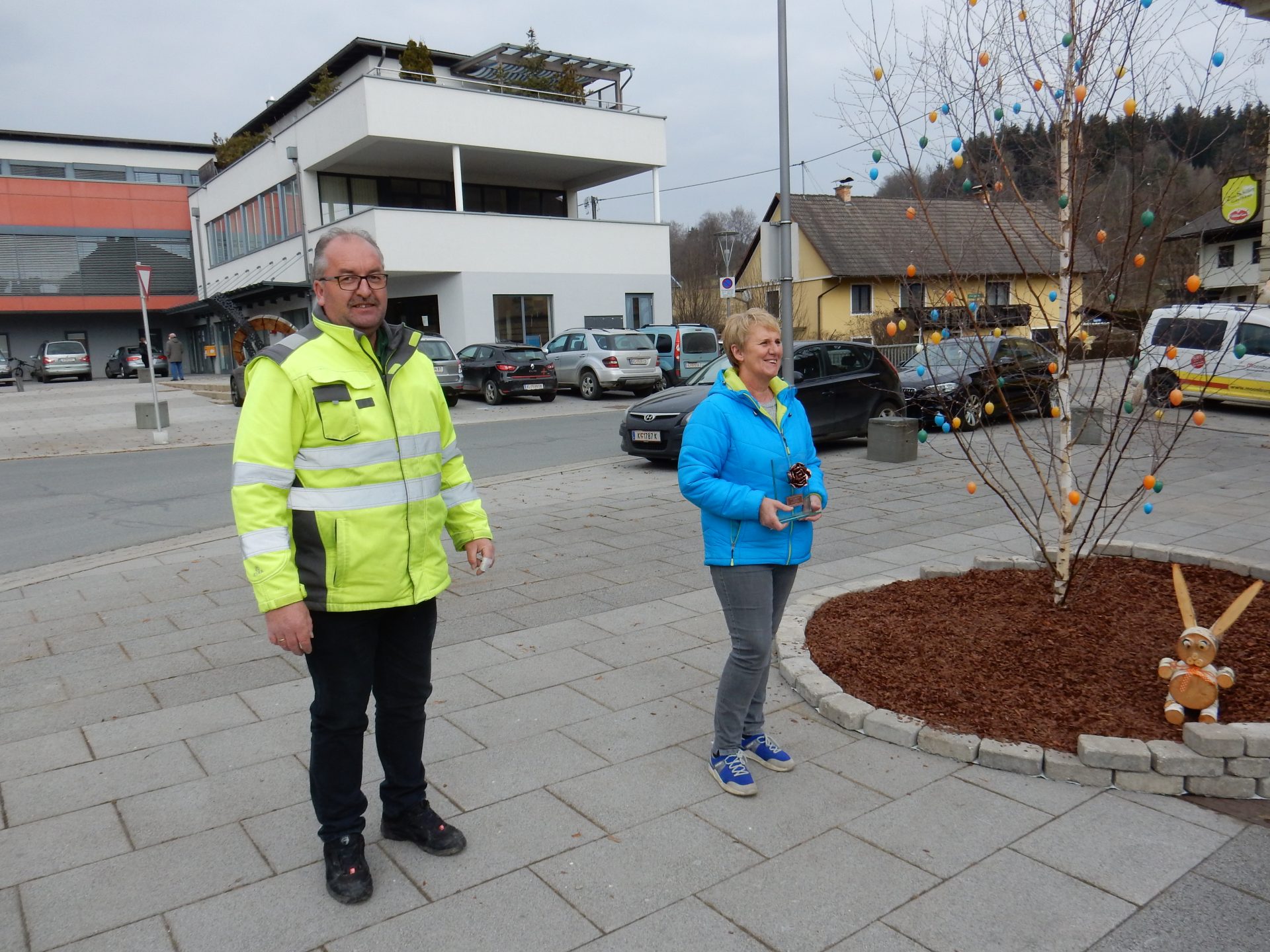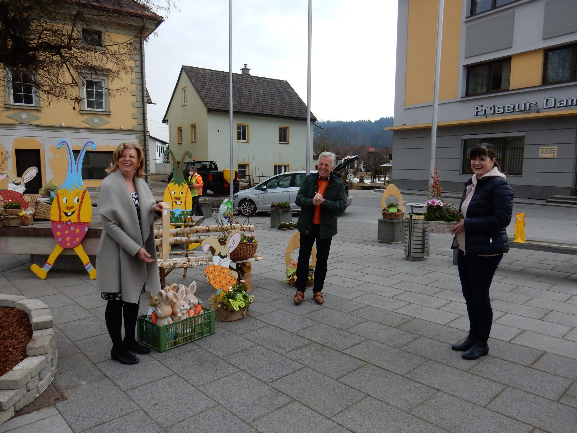 Bürgermeister Gaggl nutzte dies gleich für einen „Ortsaugenschein“ beim Aufbau der Osterdekoration am Kirchplatz und versprach, dass die Marktgemeinde Moosburg auch in diesem Jahr wieder an der Blumenolympade teilnehmen wird.
