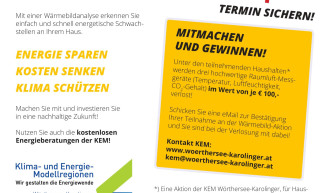 Vom 2.01.2025 bis 28.02.2025 können Einfamilienhausbesitzer an der Wärmebildaktion von „Unser Lagerhaus“ teilnnehmen: Einfach und schnell können energetische Schwachstellen erkannt werden. Alle teilnehmenden Haushalte nehmen an der Verlosung von drei hochwertigen Raumluft-Messgeräten teil, einer Aktion der KEM – Klima- und Energie-Modellregion Wörthersee Karolinger. Alle Informationen finden Sie im angefügten Flugblatt. Downloads Infoflyer Wärmebild-Aktion 2025 JPG, 904…