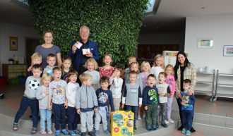 Anlässlich der Zertifizierung „Gesunde Küche“ des Kindergartens Moosburg versprach Bürgermeister Herbert Gaggl Schokolade für alle Kids. „Was ich den Kindern verspreche, das halte ich auch“, so der Bürgermeister und stellte sich mit den süßen Köstlichkeiten ein. Die Kinder hatte eine große Freude.