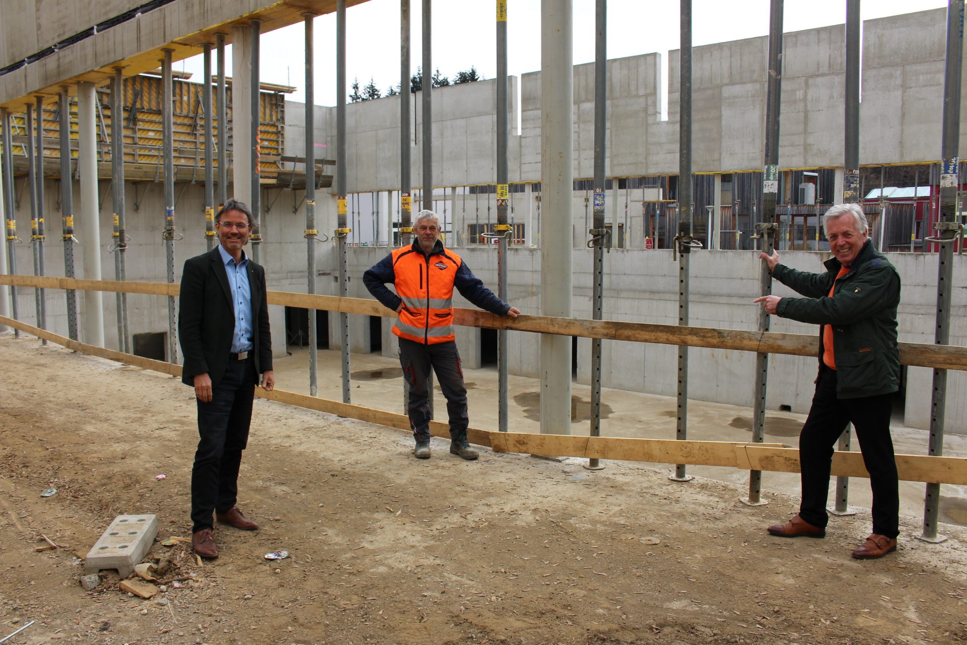 Moosburg bekommt eine neue Ballsporthalle mit Mensa. Die Bauarbeiten gehen zügig voran. „Ich freue mich sehr, dass die bauausführende Firma Switelsky mit vollem Einsatz baut. Die Halle wächst. Das ist ein Jahrhundertprojekt“, sagt Bürgermeister Herbert Gaggl. Foto: Ing. Norbert Guggenberger (Swietelsky, der verantwortliche Baupolier und Bgm. Herbert Gaggl (vl) anlässlich einer Baubesichtigung.