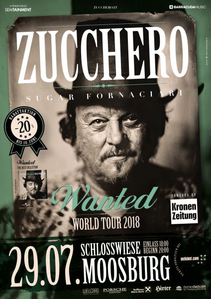 Der weitgereiste Adelmo Fornaciari, kurz: Zucchero, beehrt auch 2018 wieder Österreich – und zwar exklusiv für zwei Konzerte & eines davon wird am 29. Juli auf der wunderschönen Schlosswiese in Moosburg über die Bühne gehen. Ein Sommer in Kärnten ohne Zucchero, unmöglich… Mit im Gepäck hat der Italo-Barde sein neues Album „WANTED“, das er anlässlich seines 30 jährigen Karrierejubiläums herausgebracht und schlicht als „The Best Collection“ untertitelt hat. Tatsächlich findet sich darauf ei…