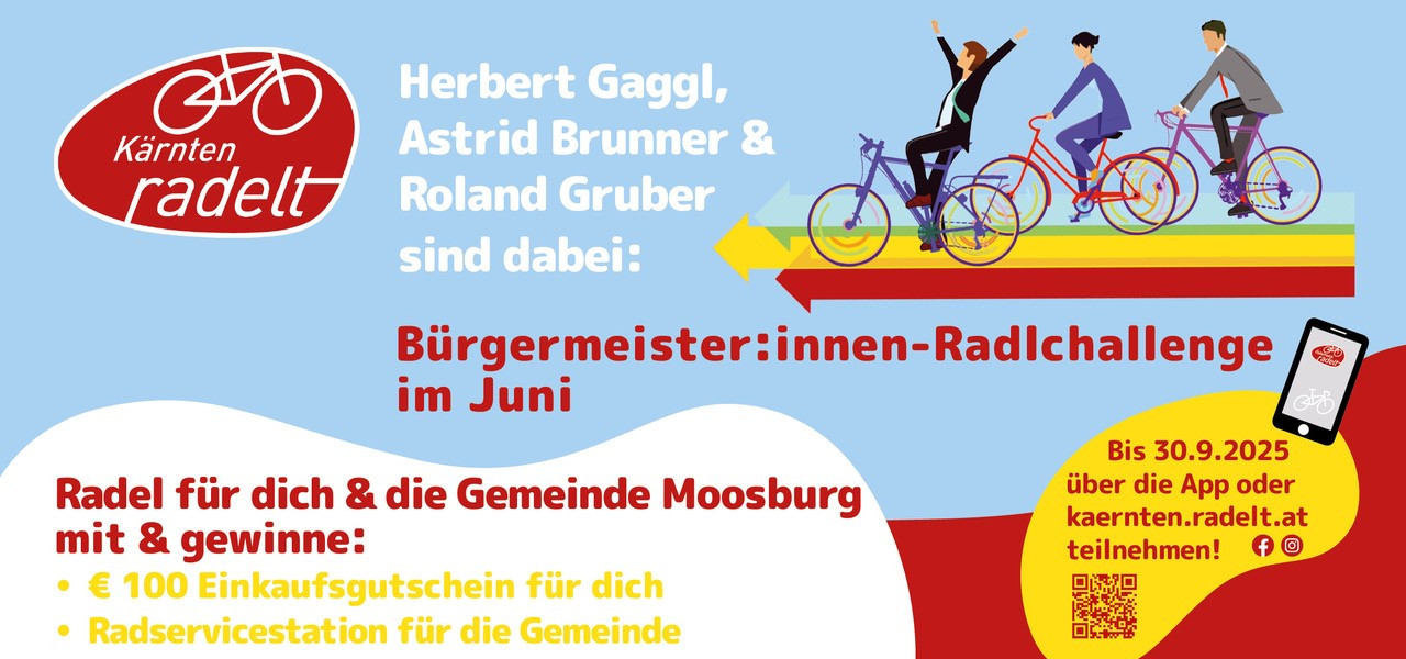 Juni 2025 wird zum Radfahr-Monat in unserer Gemeinde, denn wir sind dabei bei der Aktion „Kärnten radelt – Bürgermeister:innen Challenge“ vom 1. bis 30. Juni 2025! In ganz Kärnten steigen in diesem Monat Ortschef:innen aufs Rad und treten kräftig in die Pedale – im sportlichen Wettstreit, aber vor allem für ein gemeinsames Ziel: nachhaltige Mobilität in unseren Gemeinden zu stärken. Auch LAbg Bürgermeister Herbert Gaggl und Vizebürgermeisterin Astrid Brunner, sowi…