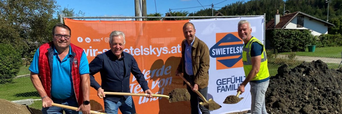 Wassermeister Eckhart Sagmeister, Bgm Herbert Gaggl, Bauleiter Günther Gfrerer und Projektant Dieter Nagelschmied beim Spatenstich.