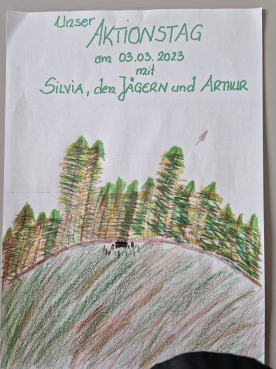 Am 3. März 2023 hatten die Tigringer Hortkinder einen aufregenden Aktionstag zur Thematik „Walderleben“ mit der Wald- und Flurpflegerin Silvia Kogler, den Jägern und Arthur, einem ausgebildeten Jagdhund. Silvia Kogler und die Jäger ließen die Hortkinder mit Geschichten und Jagdutensilien in den Jäger*innenalltag eintauchen. Der Wald als Bildungsraum wurde erkundet, für die Kinder gab es einen Streicheltisch mit tierischen Waldbewohnern und ein Wald-Quiz. Das Highlight an diesem Aktionstag bildete Arthur. Dieser führte den Kindern all seine Kunststücke vor, spürte die Fährte einer versteckten Fuchs-Jagdtrophäe auf und brachte das Objekt stolz seinem Herrl. Die Waldabenteuer unserer zertifizierten „Waldfüchse“ mit Silvia Kogler, den Jägern und Arthur sind noch nicht zu Ende – es folgen weitere Treffen im Bildungs- und Erlebnisraum „Wald“. Arthur und der Wald wurden von den Kindern selbst gezeichnet. „Ich bin sehr stolz“ auf unsere Moosburger Jugend, die sich so aktiv und interessiert an den Projekten beteiligen, sagt Bürgermeister Herbert Gaggl.