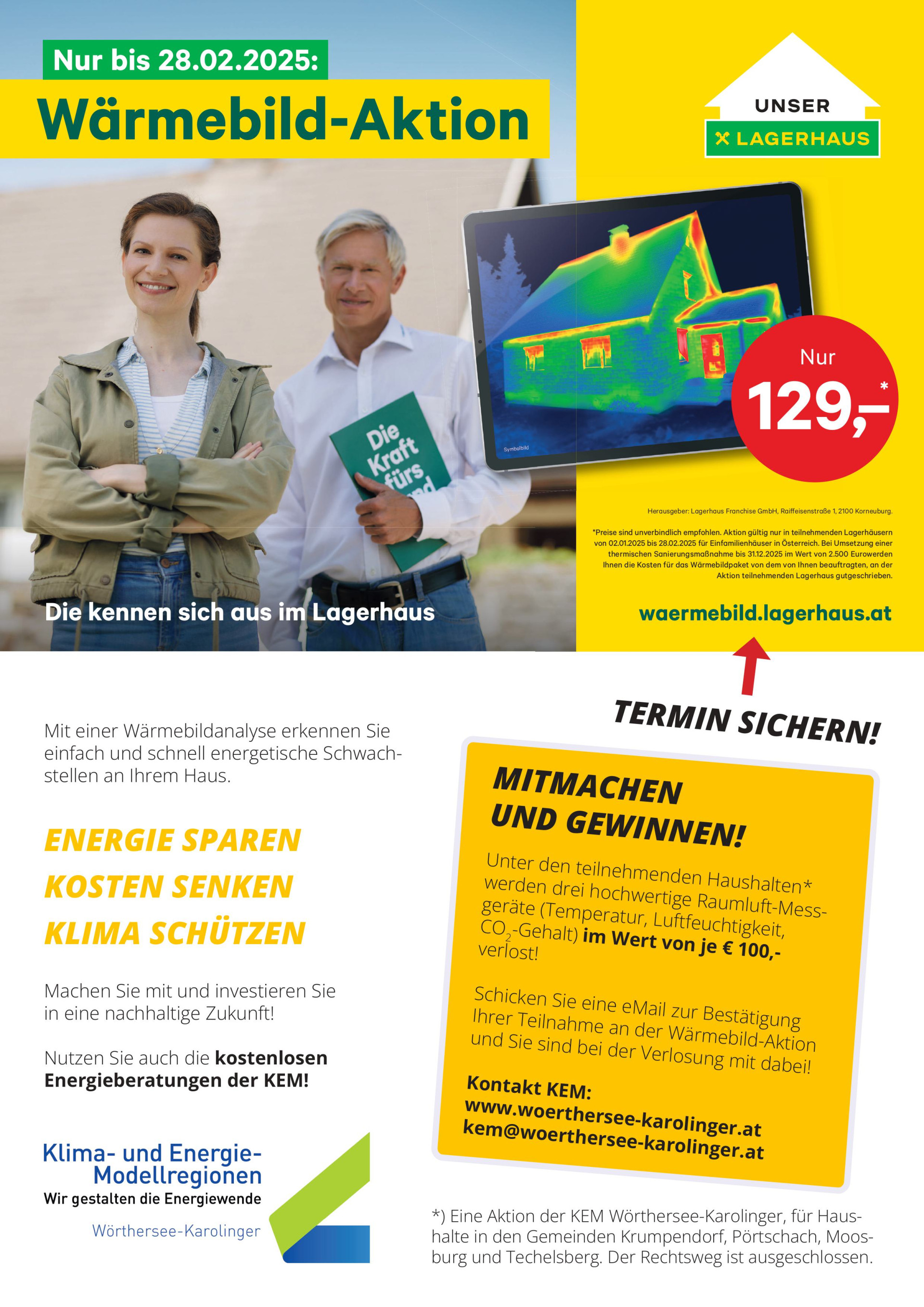 Vom 2.01.2025 bis 28.02.2025 können Einfamilienhausbesitzer an der Wärmebildaktion von „Unser Lagerhaus“ teilnnehmen: Einfach und schnell können energetische Schwachstellen erkannt werden. Alle teilnehmenden Haushalte nehmen an der Verlosung von drei hochwertigen Raumluft-Messgeräten teil, einer Aktion der KEM – Klima- und Energie-Modellregion Wörthersee Karolinger. Alle Informationen finden Sie im angefügten Flugblatt.