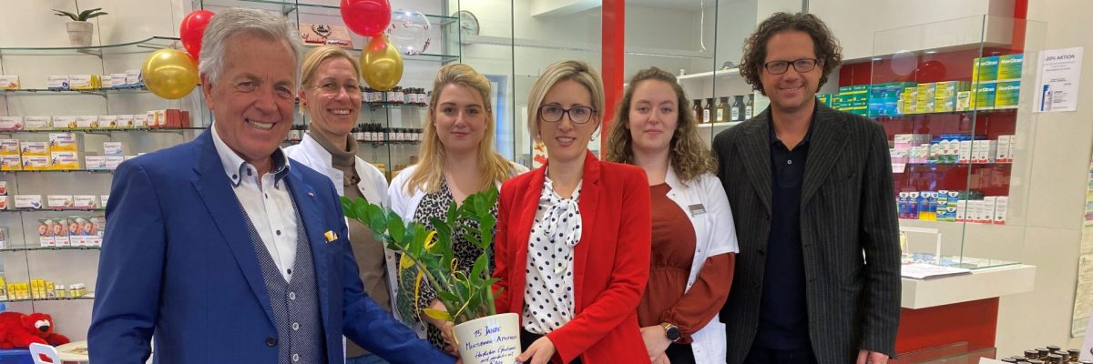 „Wir haben 10 Jahre für den Standort gekämpft und mussten viele Hürden überspringen. Es ist uns aber gelungen, die Genehmigung für den Apotheken-Standort Moosburg zu bekommen. Heute können wir sagen, es ist eine Erfolgsgeschichte“, sagte Bürgermeister Herbert Gaggl anlässlich des Jubiläumsbesuches am 3. November. „Ich wünsche Apothekerin Mag. Elissa Zach und ihrem Team alles Gute und weiterhin auch wirtschaftlichen Erfolg und bedanke mich für ihren Einsatz zum Wohle der Gesundheit unserer Bevölkerung“, so der Bürgermeister.