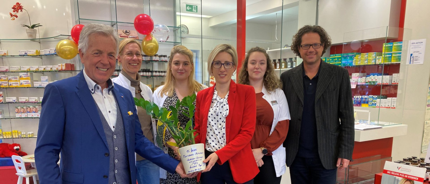 „Wir haben 10 Jahre für den Standort gekämpft und mussten viele Hürden überspringen. Es ist uns aber gelungen, die Genehmigung für den Apotheken-Standort Moosburg zu bekommen. Heute können wir sagen, es ist eine Erfolgsgeschichte“, sagte Bürgermeister Herbert Gaggl anlässlich des Jubiläumsbesuches am 3. November. „Ich wünsche Apothekerin Mag. Elissa Zach und ihrem Team alles Gute und weiterhin auch wirtschaftlichen Erfolg und bedanke mich für ihren Einsatz zum Wohle der Gesundheit unserer Bevölkerung“, so der Bürgermeister.