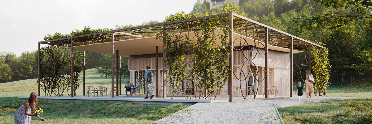 Visualisierung des Gastrogebäudes. Die Bauarbeiten haben begonnen. Fertigstellung Juni 2025.