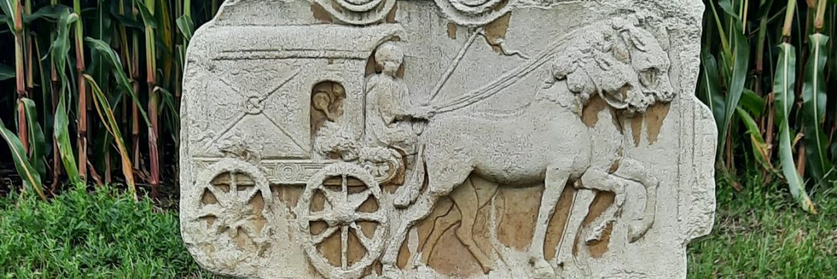 Den Reisewagen mit zwei Pferden lenkt ein Kutscher im Kapuzenmantel. Die Pferde sind offenbar mit einem gepolsterten Joch (und nicht mit einem Kummet) angeschirrt. Das Verdeck des Wagens ist aus Leder, dessen Prägung Delphine und Rosetten zeigt. Vor der Lederbespannung sind gekreuzte Metallstäbe und bronzene Greifenköpfe für die Lederriemen der Wagenkastenaufhängung zu erkennen. In der Öffnung des Verdecks sitzt gegen die Fahrtrichtung eine Dienerin mit Spiegel, die ahnen lässt, dass im geschlossenen Teil des Verdecks ihre Herrin sitzt. Die Wagenfahrt steht als Gleichnis für die Reise ins Jenseits.