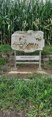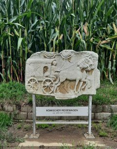 - Wagenszene: Rechteckfeld mit zweifach geschwungenem oberen Rahmen. Vierrädriger Planwagen mit Zweigespann, Kutscher mit Kapuzenmantel und Peitsche, in der mit Rosetten verzierten Plane rundbogige Öffnung, durch die man eine sitzende Frau mit rundem Gegenstand in der Hand sieht. Auf dem Rand des Wagenkastens Greifenköpfe.