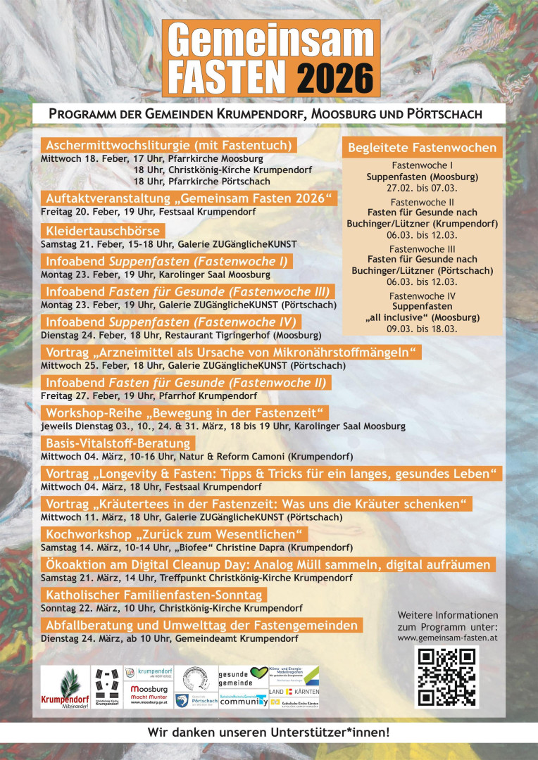 Das gemeindeübergreifende Fastenprojekt „Gemeinsam Fasten 2026“ wird am Freitag 20. Februar 2026 im Festsaal der Gemeinde Krumpendorf offiziell eröffnet. Neben einleitenden Worten von Vertreter*innen aller Institutionen, die das Projekt mit organisiert haben, erwartet die Besucher*innenein Impulsvortrag von Autorin und Gesundheitsexpertin Mag.a Tabitha Gütler zum Thema „Gesundheitsprävention leicht gemacht“. Anschließend stellen die Fastenleiter*innen ihre Fastenwochen vor und Sie erfahren mehr zum vielseitigen Programm, das neben dem klassischen Fasten auch Vorträge, Beratungen, Kleidertausch, Workshops, etc. beinhaltet.